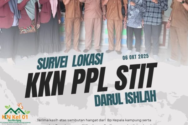 📍 Survei Lokasi KKN PPL STIT Darul Ishlah🗓️ 06 Oktober 2025🏠 Kampung Wira Agung Sari, Kecamatan Penawar Tama, Kabupaten Tulang Bawang Kegiatan survei lokasi dilaksanakan oleh kelompok 1 KKN PPL STIT Darul Ishlah di Kampung Wira Agung Sari. Dalam kunjungan ini, tim KKN disambut dengan hangat oleh Bapak Kepala Kampung beserta perangkat desa di Kantor…
