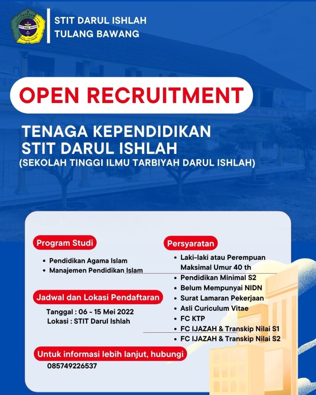 BeritaOpen Recruitment Tenaga Kependidikan STIT Darul Ishlah, Lampung admin_1 week ago1 week ago01 mins Post navigation Previous: Program Studi S1 Manajemen Pendidikan Islam di Sekolah Tinggi Ilmu Tarbiyah (STIT) Darul Ishlah Tulang Bawang, Lampung, telah berhasil memperoleh akreditasi dengan peringkat “Baik” dari Lembaga Akreditasi Mandiri Kependidikan (LAMDIK)Next: Open Recruitment Dosen STIT Darul Ishlah Tulang Bawang, Lampung Leave a Reply Cancel replyYour email address will not be published. Required fields are marked *Comment * Name * Email * Website Save my name, email, and website in this browser for the next time I comment.